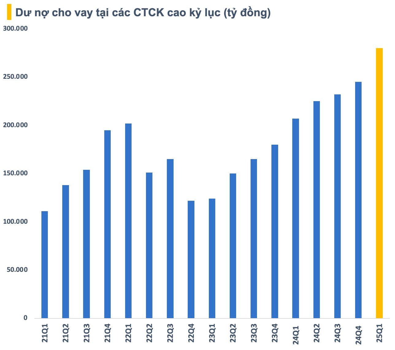 Tại thời điểm cuối quý 1/2025, dư nợ cho vay toàn thị trường lên đến 280.000 tỷ đồng, trong đó cho vay margin ước tính vào khoảng 273.000 tỷ, cao kỷ lục từ trước đến nay.