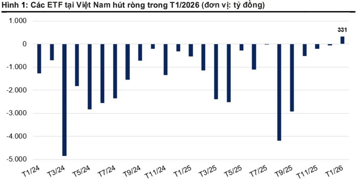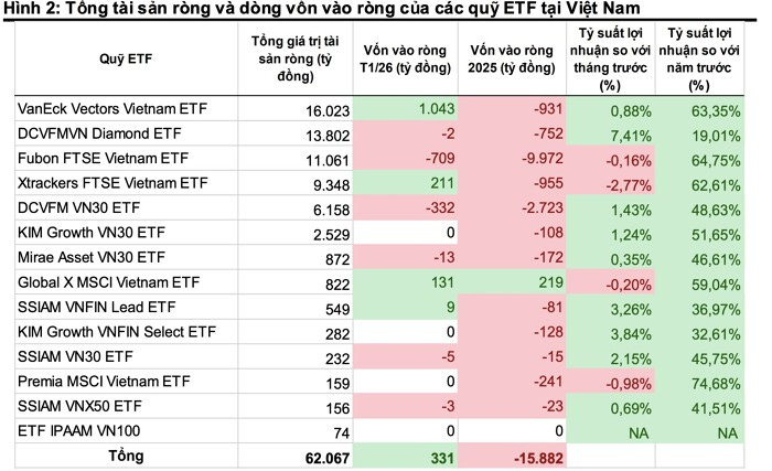 Theo báo cáo ETF tháng 1 của VNDirect Research, các ETF cổ phiếu tại Việt Nam ghi nhận dòng vốn hút ròng 331 tỷ đồng, đánh dấu sự đảo chiều so với xu hướng rút vốn trước đó. Dòng tiền vào chủ yếu đến từ VanEck Vectors Vietnam ETF với giá trị mua ròng 1.043 tỷ đồng, Xtrackers FTSE Vietnam ETF 211 tỷ đồng và Global X MSCI Vietnam ETF 131 tỷ đồng.