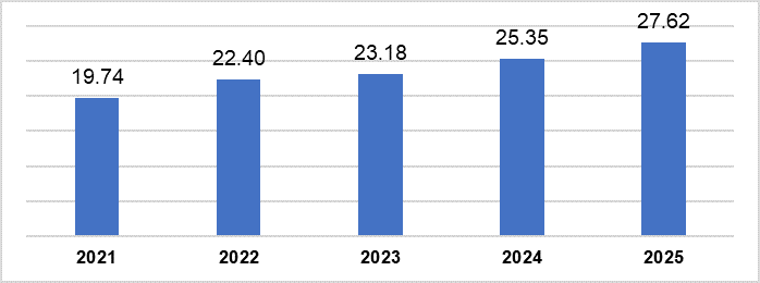 Vốn đầu tư trực tiếp nước ngoài thực hiện các năm 2021-2025, đơn vị: tỷ USD. (Nguồn: Cục Thống kê).