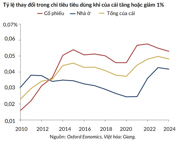 Tương tự, khi giá trị tài sản tích lũy từ nhà đất tăng 1 USD, chi tiêu cũng tăng khoảng 0,04 USD, cao hơn mức 0,03 USD ghi nhận trong quá khứ.