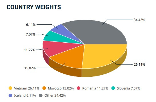 Tại ngày 31/07/2025, Việt Nam vẫn là quốc gia chiếm tỷ trọng cao nhất trong rổ chỉ số của MSCI Frontier Market Index với tỷ lệ hơn 26%. Xếp sau là Morocco với hơn 15%, và Romania với gần 11.3%.