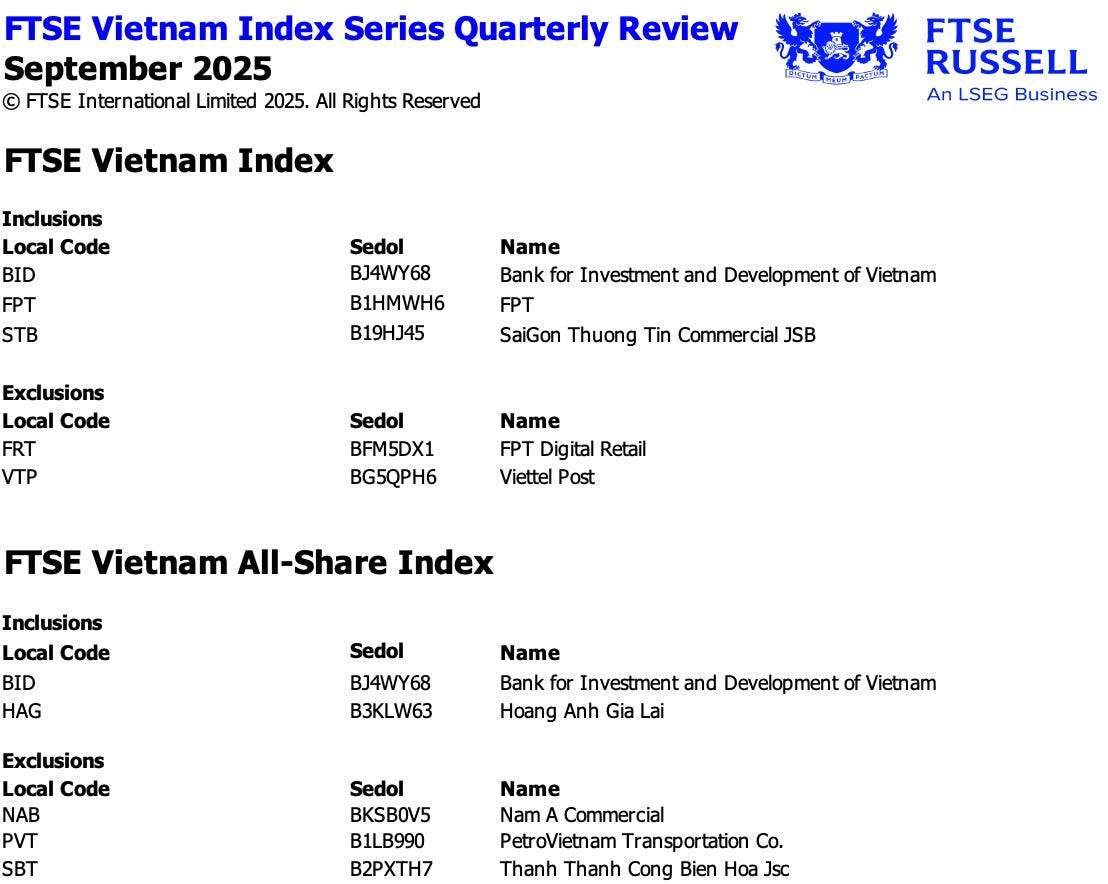 Chiều 05/09/2025, FTSE Russell công bố danh mục cổ phiếu thành phần trong kỳ review quý 3/2025 của 2 rổ chỉ số FTSE Vietnam Index và FTSE Vietnam All-Share.