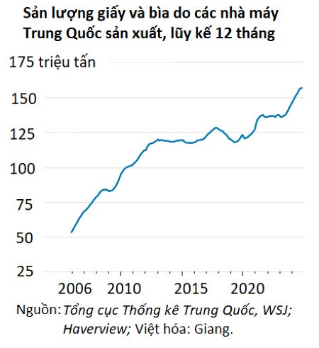 Theo Tổng cục Thống kê Trung Quốc, sản lượng giấy và bìa của Trung Quốc trong 10 tháng đầu năm 2024 tăng khoảng 10% so với cùng kỳ năm ngoái, mặc cho giá giấy bán buôn liên tục giảm kể từ tháng 10/2022.