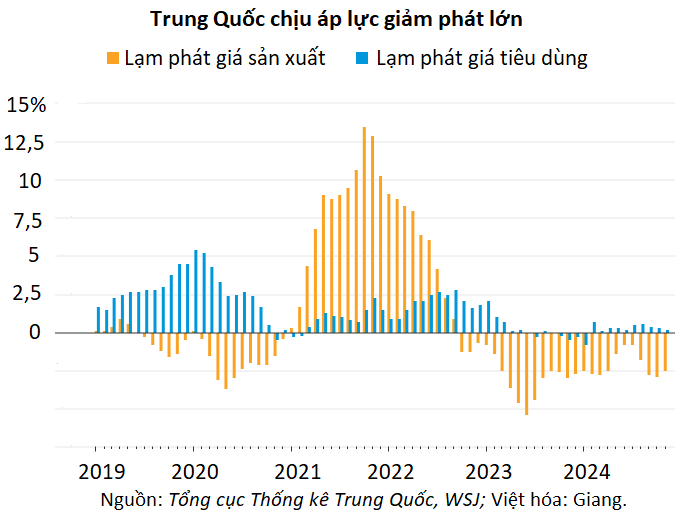 Chỉ số giá sản xuất (PPI) của Trung Quốc đã giảm so với cùng kỳ năm trước trong 26 tháng liên tiếp và có rất ít dấu hiệu sẽ sớm phục hồi. Chỉ số giảm phát GDP (GDP deflator), thước đo tổng quát về giá cả trên toàn nền kinh tế, đã xuống dưới mức 0 trong 6 quý liên tiếp - khoảng thời gian dài nhất kể từ cuối thập niên 1990.