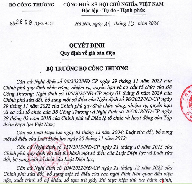 Bộ Công Thương vừa ban hành Quyết định số 2699/QĐ-BCT ngày 11/10/2024 quy định về giá bán điện, trong đó ban hành giá bán lẻ điện cho các nhóm khách hàng sử dụng điện và giá bán lẻ điện cho các đơn vị bán lẻ điện.
