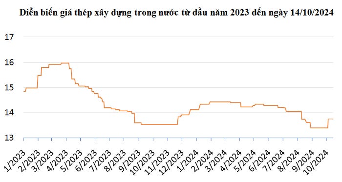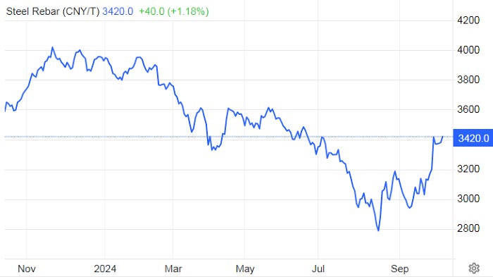 Trên sàn giao dịch Thượng Hải (giờ Việt Nam), giá thép thanh tăng 1,18% lên 3.420 CNY/tấn lúc 14h30 (giờ Việt Nam) chiều ngày thứ Hai (14/10). Đây là mức giá cao nhất kể từ ngày 19/6 khi giá thép kết phiên ở mức 3.480,9 CNY/tấn.