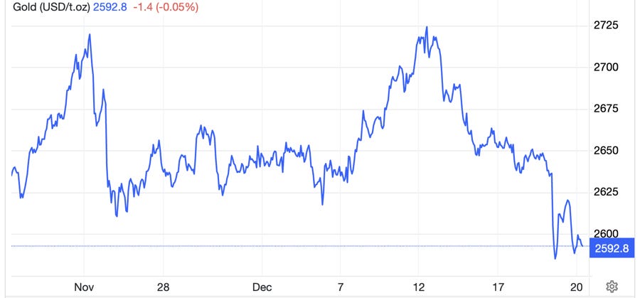 Hôm thứ Tư, giá vàng sụt 2,4% xuống mức thấp nhất 1 tháng sau khi Cục Dự trữ Liên bang Mỹ (Fed) dự báo sẽ chỉ giảm lãi suất 2 lần trong năm 2025, bằng một nửa so với dự báo 4 lần giảm đưa ra hồi tháng 9.