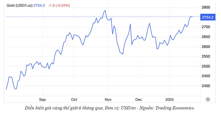 Trên thị trường quốc tế, giá vàng thế giới đang ở vùng cao nhất kể từ cuối tháng 10 năm ngoái - thời điểm giá vàng giao ngay đạt kỷ lục mọi thời đại ở mức hơn 2.790 USD/oz.