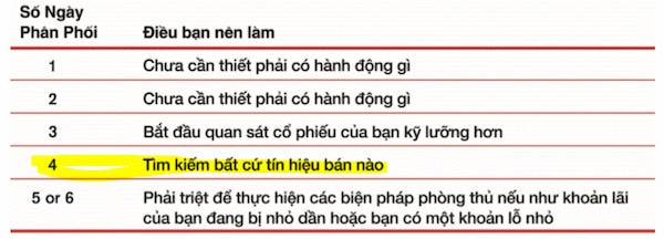 Khá nhiều mơ hồ ở điểm này. O’Neil nói: “Nếu bạn nhìn thấy 6 ngày phân phối trong bất cứ khoảng thời gian 4-5 tuần nào, thị trường chung nhiều khả năng sẽ có điều chỉnh.” Trong cuốn sách “Hướng Dẫn Thực Hành CANSLIM”, đội ngũ IBD đưa ra hướng dẫn như sau về số ngày phân phối và điều bạn nên làm. Tuy nhiên, mọi việc không hề đơn giản như vậy. Chưa hẳn có đủ 4 ngày phân là thị trường sẽ đảo chiều từ “Xu Hướng Tăng Được Xác Nhận” sang đèn vàng hoặc đèn đỏ. Đôi khi là có nhưng đôi khi là không tùy thuộc vào hành động giá của Index.