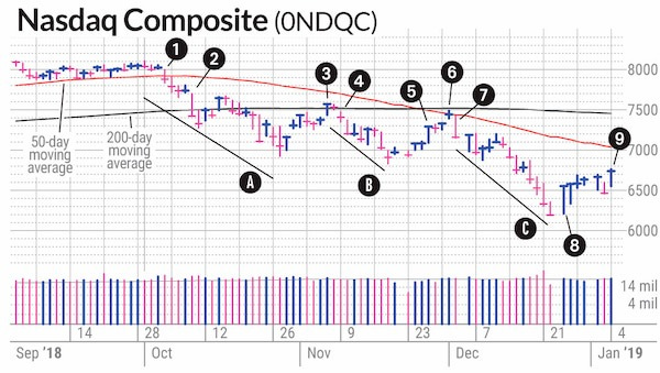 Tại điểm số (3), vào ngày 7/11, thị trường cố gắng tạo ngày Bùng Nổ Theo Đà FTD nhưng chỉ hai ngày sau đó, giá giảm xuống dưới đáy ngày FTD, tạo nên dấu hiệu nghi ngờ sự thất bại. Giá cũng thất bại vượt qua MA200 ngày. Lúc đó, thị trường bước vào sóng giảm B.