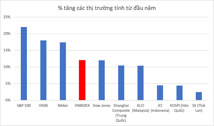 Mặc dù vậy, nếu tính từ đầu năm, VN-Index vẫn đạt được mức tăng tích cực 12% vào cuối tháng 10, trong đó chỉ số VN30 có mức tăng 18%, cao hơn các thị trường chứng khoán châu Á.