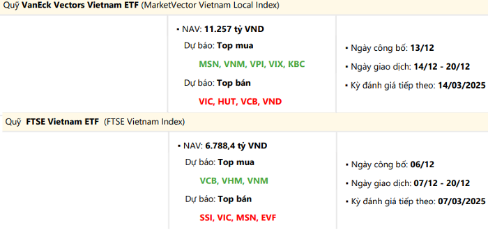 Ngày 6/12, FTSE Russell sẽ công bố danh mục cổ phiếu thành phần bộ chỉ số FTSE Vietnam All-share và FTSE Vietnam Index. Tới ngày 13/12, MarketVector sẽ công bố danh mục MarketVector Vietnam Local Index. 20/12 dự kiến là ngày hoàn tất việc cơ cấu danh mục của các ETF tham chiếu theo những bộ chỉ số này.