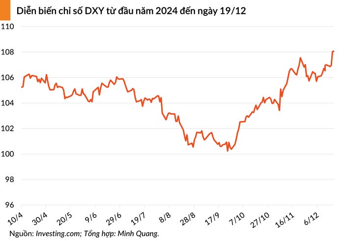 2024 tiếp tục là một năm biến động mạnh của tỷ giá khi đồng USD vẫn duy trì sức mạnh. Việc Cục Dự trữ Liên bang Mỹ (Fed) không hạ lãi suất nhanh như kỳ vọng và chiến thắng của ông Donald Trump trong cuộc đua vào Nhà Trắng đã khiến chỉ số USD Index (DXY) liên tục tăng cao.