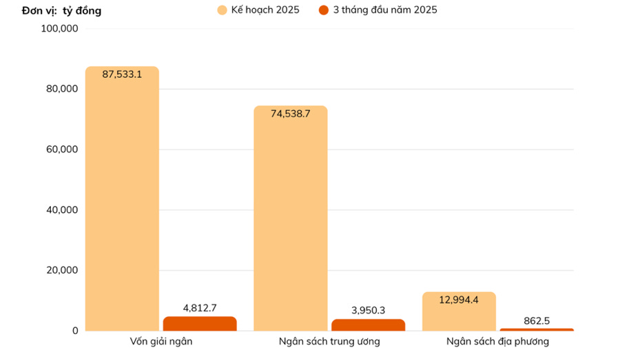 Tuy nhiên, tính đến ngày 31/3, tổng giá trị giải ngân mới đạt 4.812,7 tỷ đồng (5,5%), gồm 3.950,3 tỷ đồng từ ngân sách trung ương (5,3%) và 862,5 tỷ đồng từ ngân sách địa phương (6,6%).