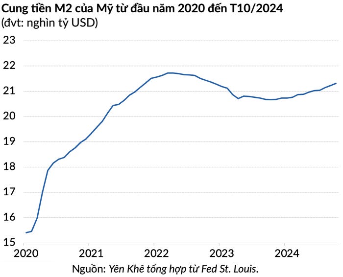 Vào tháng 4/2022, cung tiền M2 đạt đỉnh 21.723 tỷ USD. Tính đến tháng 10/2024, cung tiền M2 đã sụt khoảng 412 tỷ USD xuống còn 21.311 tỷ USD, tương đương mức giảm 1,89%.