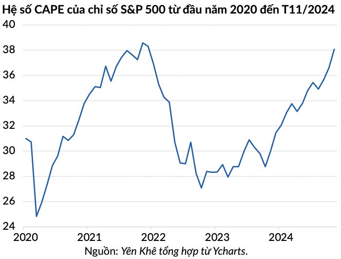 Tại ngày 26/12/2024, hệ số CAPE của chỉ số S&P 500 đạt 38,08 - gần mức cao nhất trong một năm là gần 39. Con số này cao hơn gấp đôi mức trung bình trong 154 năm qua là 17,19 và là mức cao thứ ba trong một thị trường giá lên liên tục kể từ tháng 1/1871.