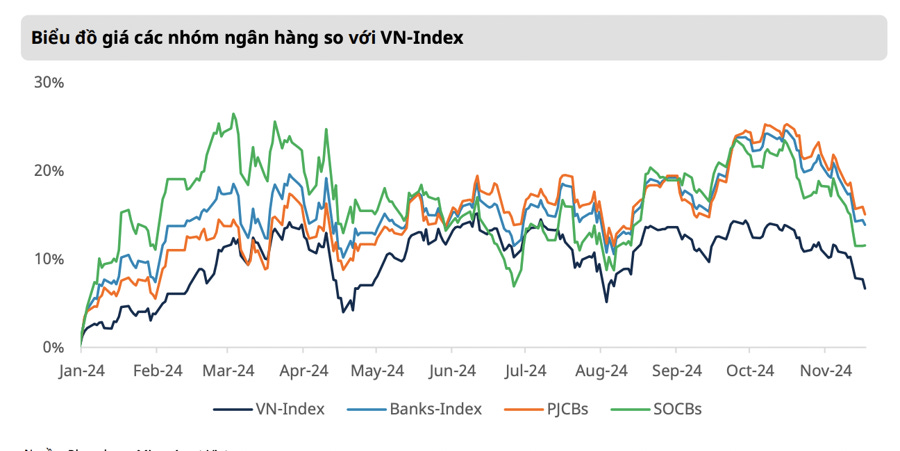 Về lợi nhuận, theo Mirae Asset, mục tiêu cả năm tương đối lạc quan so với mức thực hiện 9 tháng năm 2024. Tăng trưởng lợi nhuận có thể giảm tốc trong Q4/2024 trước hết do ảnh hưởng từ mức nền cao của Q4/2023 và kế hoạch tăng trích lập dự phòng khi nhiều ngân hàng cho rằng họ sẽ cần chi nhiều hơn cho khoản chi phí này nhằm cải thiện chất lượng tài sản.
