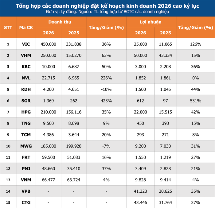 Đáng chú ý, Tổng CTCP Địa ốc Sài Gòn (Mã: SGR) là trường hợp có mức tăng cao nhất khi doanh thu dự kiến tăng gần 423% và lợi nhuận tăng 531%; nếu đạt được, đây cũng sẽ là mức kỷ lục của doanh nghiệp. Bên cạnh đó, Tổng Công ty Phát triển Đô thị Kinh Bắc (Mã: KBC) và CTCP Đầu tư và Kinh doanh Nhà Khang Điền (Mã: KDH) cũng đặt mục tiêu kinh doanh cao nhất từ trước tới nay trong năm 2026.