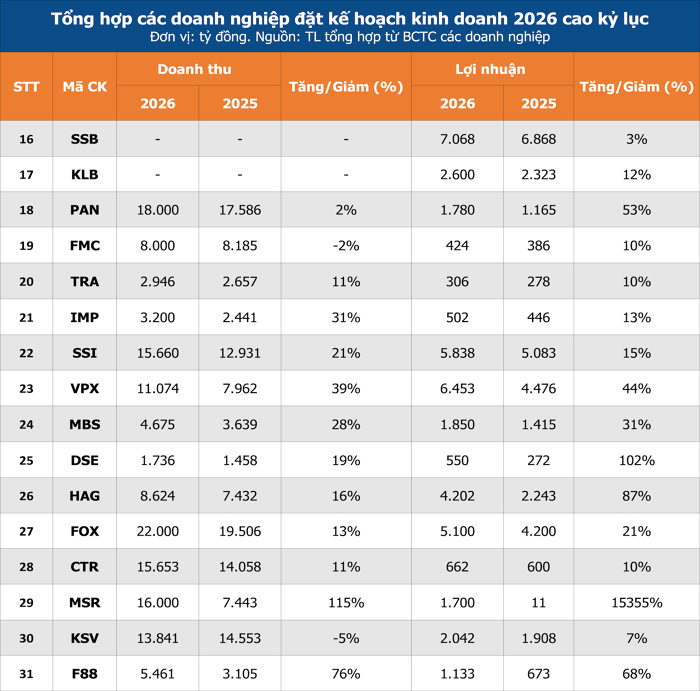 Ở nhóm chứng khoán, triển vọng kế hoạch được thể hiện ở cả doanh thu và lợi nhuận. CTCP Chứng khoán SSI (Mã: SSI), CTCP Chứng khoán VPBank (Mã: VPX), CTCP Chứng khoán MB (Mã: MBS) và CTCP Chứng khoán DNSE (Mã: DSE) đều hướng tới các mốc kỷ lục mới, với lợi nhuận dự kiến tăng từ khoảng 14% đến 102% so với năm 2025.