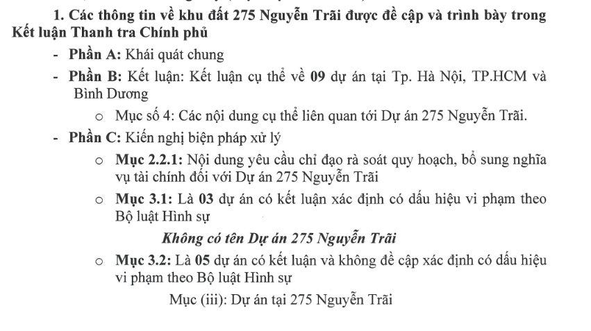 TCH cho biết cho biết nhà đầu tư cần phân biệt rõ và chính xác thông tin dự án 275 Nguyễn Trãi nằm trong 5 dự án thuộc danh mục 3.2 - mục C là thực hiện chuyển thông tin, tài liệu. Dự án này không thuộc mục 3.1 - Mục C tại kết luận Thanh tra Chính phủ cần phải chuyển hồ sơ, tài liệu để xử lý.