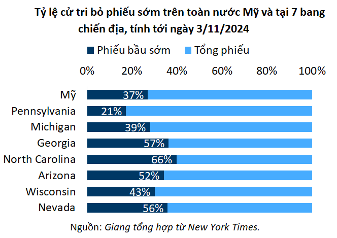Tờ New York Times cho biết tính tới ngày 3/11, gần 76 triệu người Mỹ đã bỏ phiếu bầu chọn tổng thống mới. Điều này có nghĩa là 37% cử tri đã bỏ phiếu sớm trước ngày bầu cử chính thức 5/11.