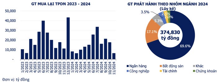 Các doanh nghiệp đã mua lại 6.204 tỷ đồng trái phiếu trong tháng 11. Tính từ đầu năm đến nay, tổng giá trị trái phiếu đã được mua lại trước hạn đạt 171.156 tỷ đồng, giảm 17% so với cùng kỳ năm 2023. Ngân hàng là nhóm ngành dẫn đầu, chiếm khoảng 72,5% tổng giá trị mua lại trước hạn (tương ứng khoảng 124.159 tỷ đồng).