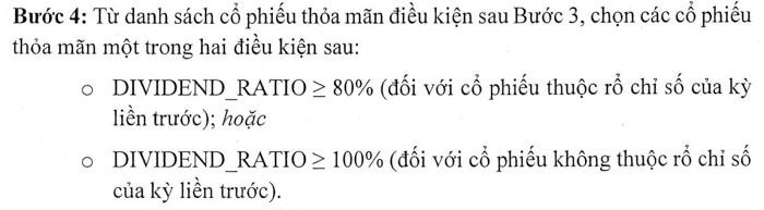 Trong bước cuối cùng, các cổ phiếu cần đạt tỷ lệ chi trả cổ tức (DIVIDEND_RATIO) tối thiểu 80% nếu đã nằm trong rổ kỳ trước, hoặc 100% nếu là cổ phiếu mới.