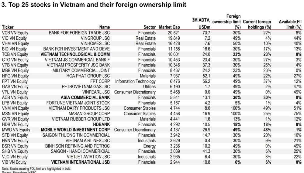 Tuy nhiên, dữ liệu của HSBC cho thấy số cổ phiếu chạm trần FOL không nhiều. Chỉ có 12 mã trong VN-Index kín room, trong khi toàn bộ chỉ số có tỷ lệ sở hữu ngoại bình quân 17% so với trần 42%.