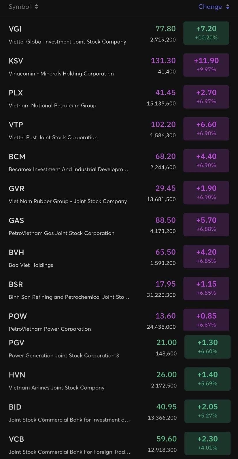 Cùng xu hướng, BVH (Tập đoàn Bảo Việt) cũng có phiên tăng trần thứ hai, chốt tại 65.500 đồng/cp - mức cao nhất 5 năm. Đà hưng phấn còn kéo theo hàng loạt “ông lớn” như KSV (tăng trần phiên thứ 4), GVR, BSR, PLX hay BCM đồng loạt tăng hết biên độ.