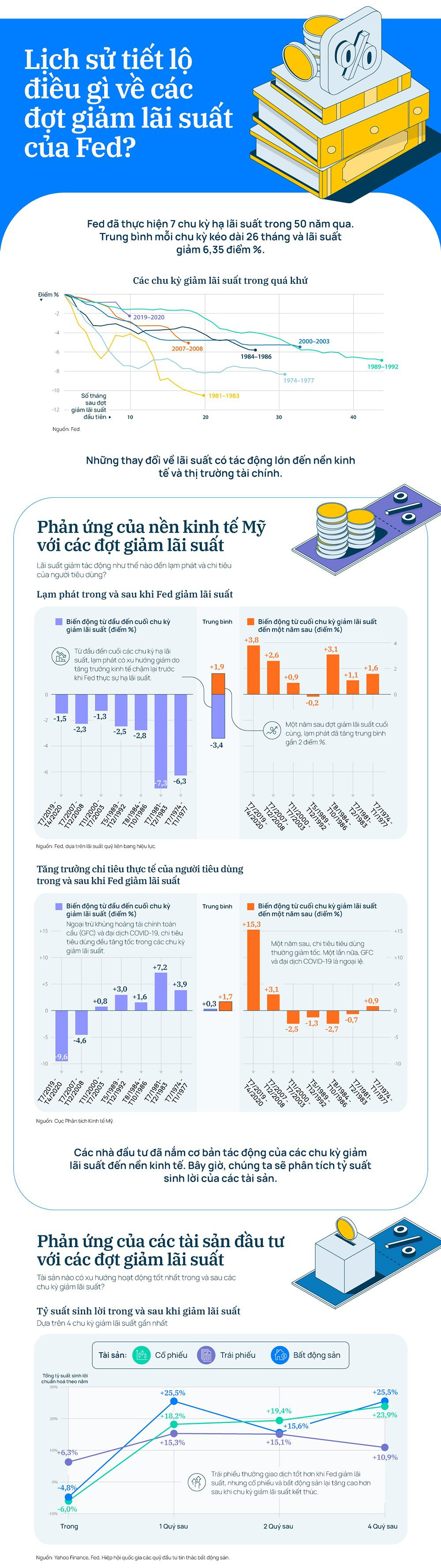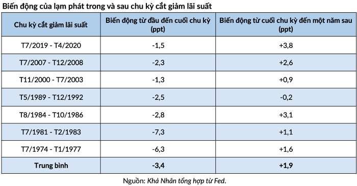 Fed đã thực hiện 7 chu kỳ cắt giảm lãi suất trong 50 năm qua. Trung bình mỗi chu kỳ kéo dài 26 tháng và lãi suất giảm khoảng 6,35 điểm %.
