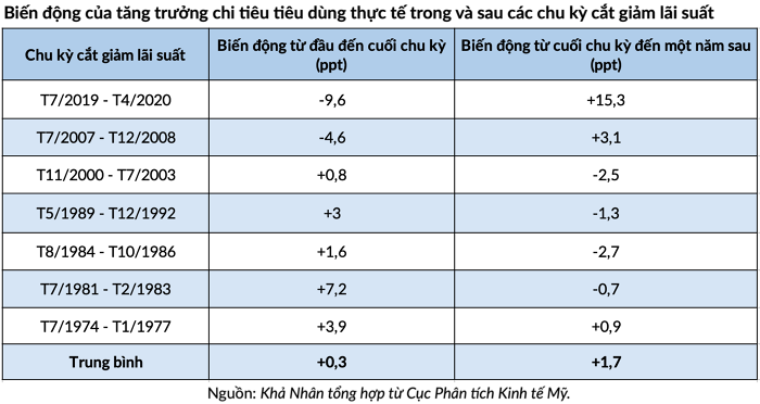 Trung bình, tăng trưởng tiêu dùng thường tăng nhẹ trong giai đoạn cắt giảm lãi suất (nhích 0,3 ppt) và tiếp tục tăng tốc trong một năm sau đó (đi lên 1,7 ppt).