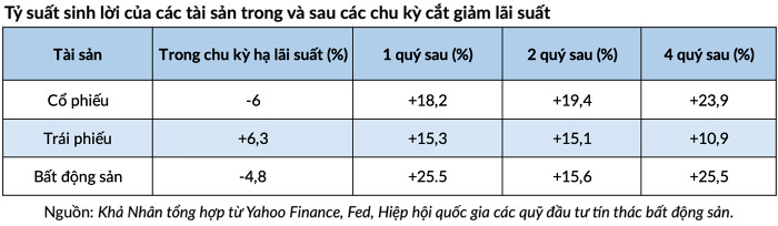 Tuy nhiên, trong các quý trước đợt cắt giảm lãi suất gần đây nhất, cả ba tài sản đều tăng giá. Một năm sau, bất động sản có tỷ suất sinh lời tốt hơn, theo sau là cổ phiếu và trái phiếu.
