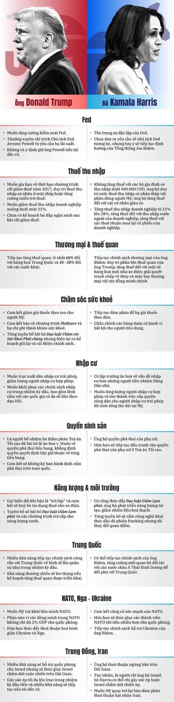 Dưới đây là tổng hợp chung về quan điểm của cựu Tổng thống Donald Trump và Phó Tổng thống Kamala Harris về các vấn đề chính, từ Cục Dự trữ Liên bang Mỹ (Fed) đến chăm sóc sức khoẻ và thương mại.