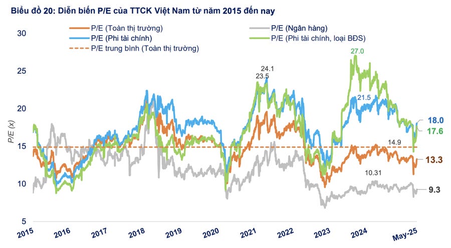 Nhịp điều chỉnh mạnh đầu tháng 4/2025 do lo ngại rủi ro thuế quan, kết hợp với nền tăng trưởng lợi nhuận ổn định trong quý 1, đã kéo định giá P/E toàn thị trường xuống mức 13,3x – thấp hơn đáng kể so với trung bình 10 năm (14,9x), theo FiinGroup.
