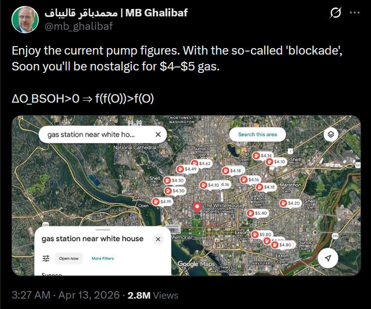 Phản ứng trước cảnh báo của Mỹ, Chủ tịch Quốc hội Iran Mohammad Bagher Ghalibaf nói Mỹ sẽ sớm hối tiếc, đăng tải hình ảnh giá xăng tại Mỹ, kèm thông điệp: “Hãy tận hưởng mức giá hiện tại, vì sớm thôi người Mỹ sẽ phải hoài niệm về mức 4-5 USD/gallon”. Ông cũng ám chỉ rằng bất kỳ sự gia tăng căng thẳng nào tại Hormuz sẽ kéo theo cú sốc giá dầu theo cấp số nhân.