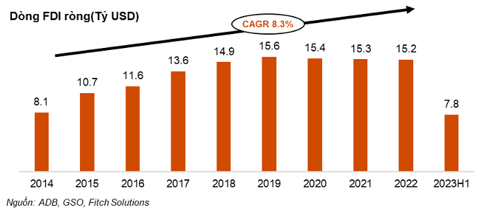 Dòng vốn FDI ròng đạt 15,2 tỷ USD vào năm 2022 với tỷ lệ tăng trưởng kép hàng năm (CAGR) là 8,3% tính từ năm 2014. Dự báo cho thấy FDI vào Việt Nam sẽ tiếp tục tăng dựa trên 4 yếu tố chính.