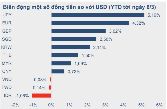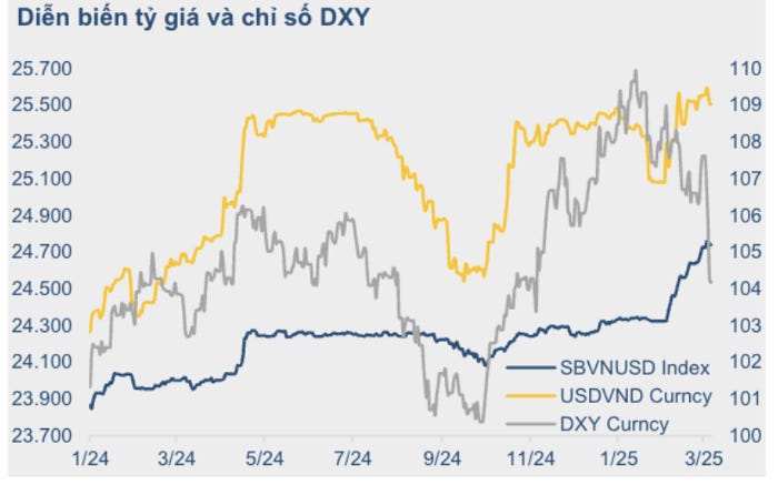 Diễn biến này giúp giảm áp lực lên các đồng tiền khác, bao gồm đồng VND. Theo đó, đầu tháng 3/2025 VND đã lên giá trở lại 0,2% so với cuối tháng 2. Đồng thời, Cục Dự trữ Liên bang Mỹ (Fed) được kỳ vọng sẽ bắt đầu hạ lãi suất từ cuộc họp tháng 6 và hạ lãi suất ba lần trong năm 2025.