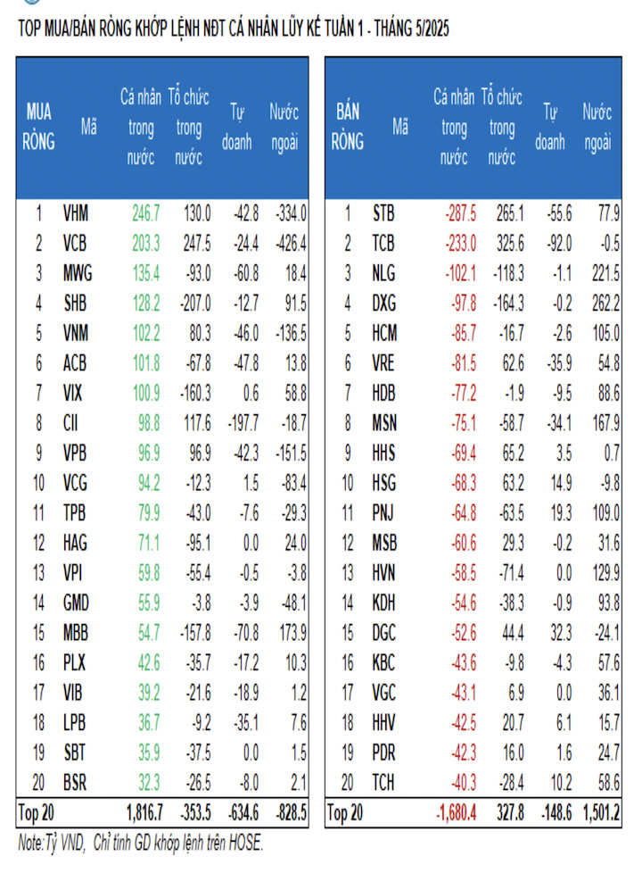 Top bán ròng là nhóm Ngân hàng. Top cổ phiếu được bán ròng gồm ClI, TCB, HPG, MBB, MWG, STB, ACB, VNM, VIC, VHM.