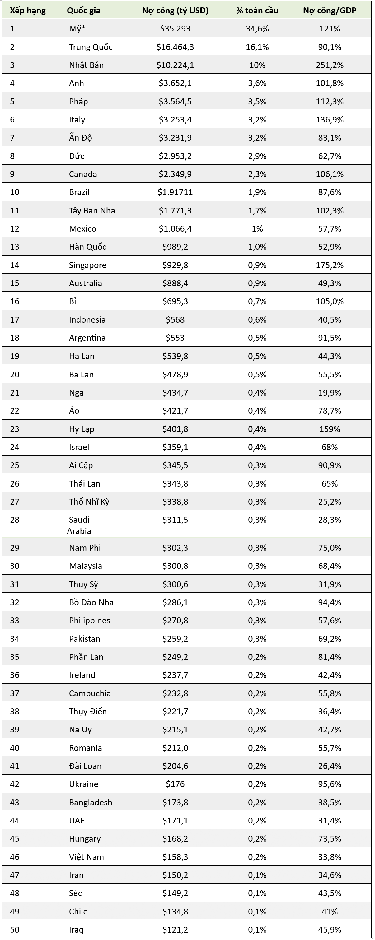 Khối nợ công 102 nghìn tỷ USD toàn cầu qua một biểu đồ, Việt Nam nằm trong top 50