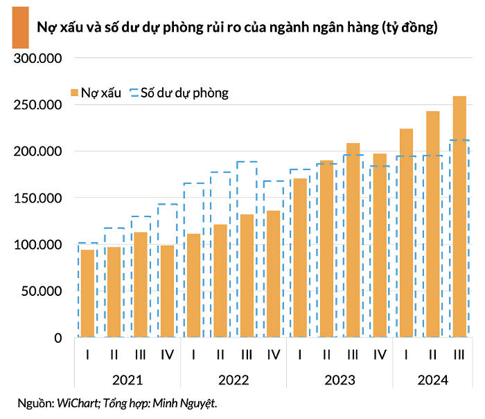 Theo số liệu của NHNN, tính đến cuối tháng 9, tỷ lệ nợ xấu nội bảng là 4,55%, tăng 8,6% so với đầu năm, gần bằng mức cuối năm 2023, tăng so với mức 2% của năm 2022. 9 tháng đầu năm, báo cáo tài chính từ 29 ngân hàng cho thấy số dư nợ xấu tiếp tục tăng 27,9% so với cuối năm 2023 lên mức 259.186 tỷ đồng, tương ứng tỷ lệ nợ xấu 2,3%.