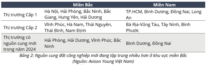 Nguồn cung đất công nghiệp tuy có sự gia tăng trong những năm gần đây nhưng còn khá hạn chế. Xét về số lượng KCN và khu chế xuất (KCX), Đông Nam Bộ và Đồng bằng sông Hồng đứng đầu cả nước với 100 và 74 KCN và KCX tính đến cuối năm 2023. Dù vậy, khi so sánh theo vùng miền, nguồn cung đất công nghiệp tại các thị trường miền Bắc đang có xu hướng tăng nhanh hơn miền Nam, ở cả thị trường cấp 1 và cấp 2.