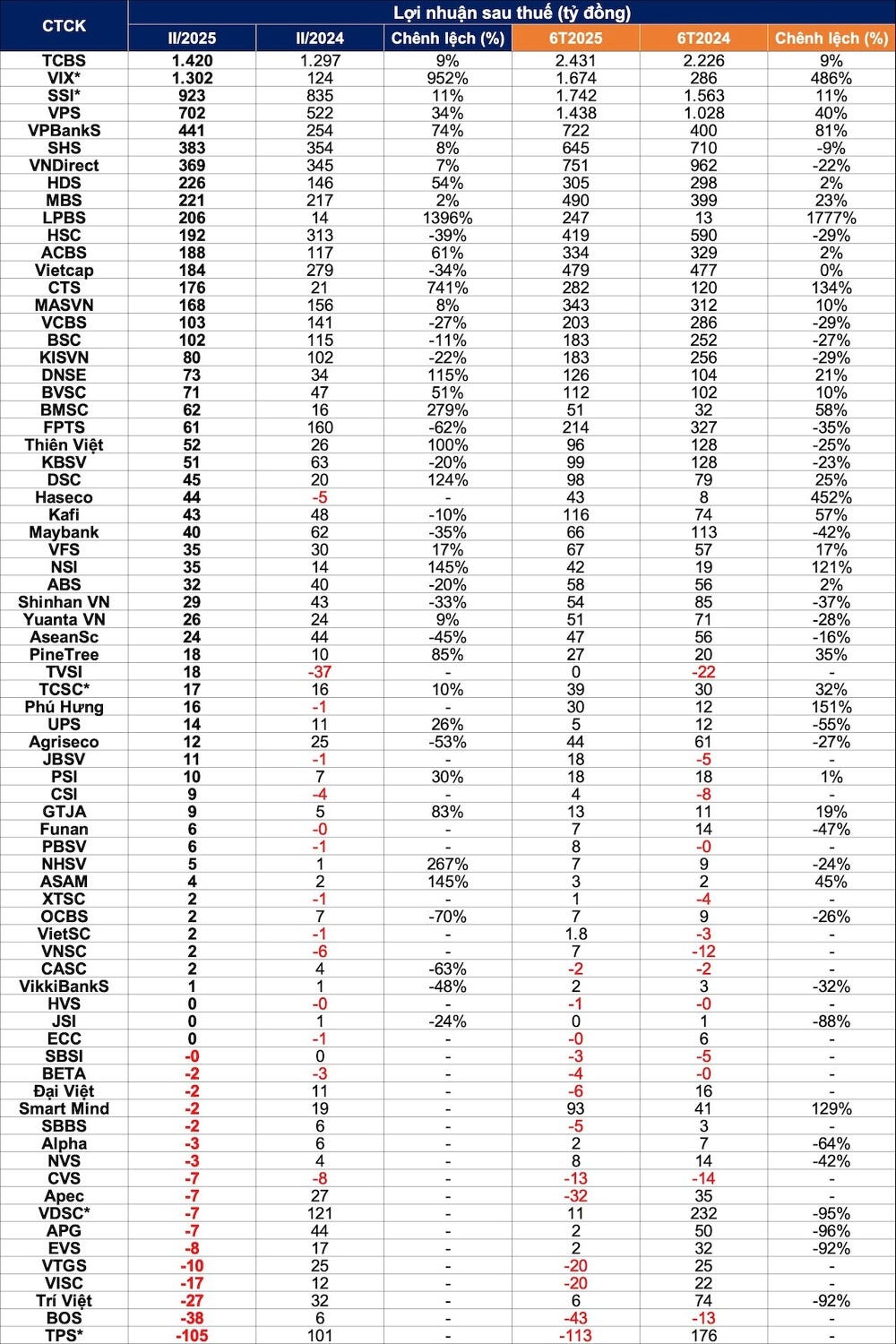 Chứng khoán Kỹ Thương (TCBS) là doanh nghiệp báo lãi lớn nhất tính đến thời điểm hiện tại. Doanh thu hoạt động quý II đạt 2.660 tỷ đồng, tăng 14% so với cùng kỳ năm ngoái. Sau khi trừ chi phí, lợi nhuận sau thuế đạt 1.420 tỷ đồng, tăng 9% và là mức cao nhất kể từ hoạt động. Lũy kế 6 tháng đầu năm, TCBS báo lợi nhuận sau thuế 2.431 tỷ đồng, tăng 9%.