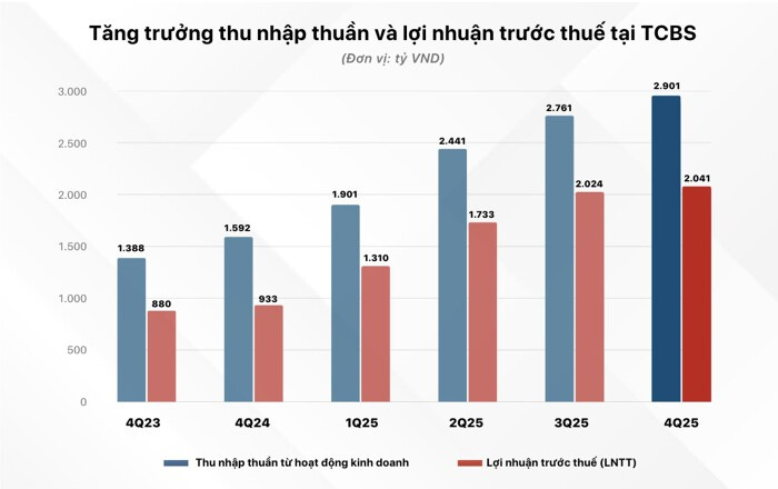 TCBS ghi nhận lợi nhuận trước thuế quý IV/2025 đạt 2.041 tỷ đồng, tăng gần 120% so với cùng kỳ năm trước. Lũy kế cả năm 2025, lợi nhuận trước thuế đạt 7.109 tỷ đồng, tăng gần 50% so với năm 2024 và vượt kế hoạch đề ra. Sau khi hoàn tất IPO và đưa cổ phiếu lên giao dịch trên HOSE trong tháng 10/2025, quy mô hoạt động của TCBS tiếp tục được mở rộng.