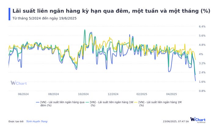 Lãi suất liên ngân hàng kỳ hạn qua đêm bất ngờ giảm xuống 1,67%/năm, thấp nhất kể từ tháng 3/2024 đến nay.