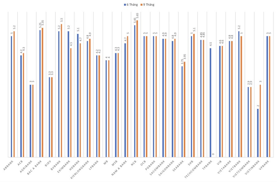 Đối với tiền gửi 9 tháng, mức lãi suất cao nhất là 5,65% năm được áp dụng tại NCB. BVBank trả lãi 5,5%/năm cho tiền gửi kỳ hạn 9 tháng, cao thứ 2 hệ thống.