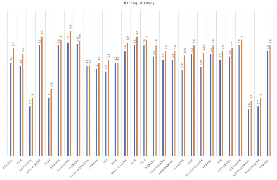 Các ngân hàng như Bắc Á, BVBank, NCB, OCB, VietBank cùng áp dụng mức lãi suất 3,8%/năm cho tiền gửi kỳ hạn 1 tháng.
