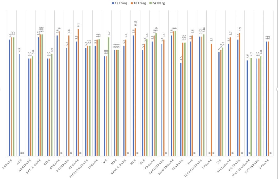 Đối với tiền gửi kỳ hạn 18 tháng, lãi suất cao nhất hiện nay là 6,15%/năm được áp dụng tại NCB, tiếp đến là HDBank với 6,1%/năm.