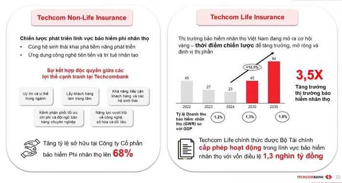 Đây cũng là một trong những cơ sở để Techcombank nhận định rằng với tỷ lệ thâm nhập của bảo hiểm nhân thọ tại Việt Nam hiện nay còn rất thấp – dưới 10%; tỷ lệ phí bảo hiểm trên GDP hiện chỉ ở mức 1,2–1,3%, là con số quá nhỏ so với nhu cầu của khách hàng trong thời gian tới.