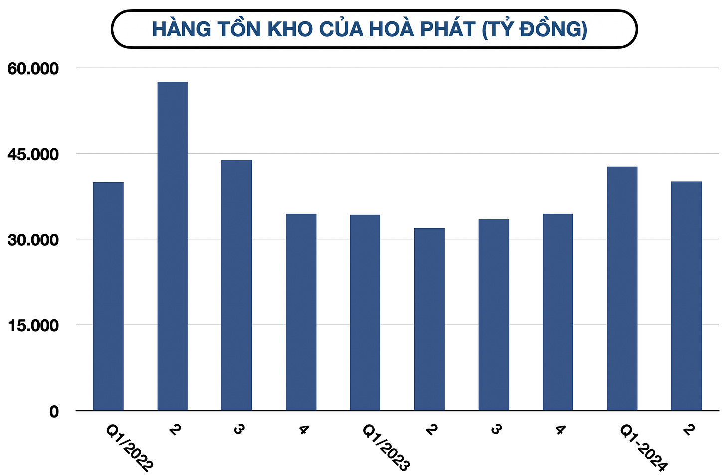 Ông lớn số 1 ngành thép là Tập đoàn Hoà Phát (Mã: HPG) ghi nhận hàng tồn kho có giá trị 40.164 tỷ đồng cuối quý II, tăng 16% so với cuối năm 2023. Hàng tồn kho tăng chủ yếu là đến từ nguyên vật liệu khi doanh nghiệp chủ động tích trữ hàng tồn kho giá thấp để giảm chi phí giá vốn, cải thiện biên lợi nhuận cũng như chuẩn bị sẵn nguồn nguyên liệu cho doanh nghiệp khi thị trường bước vào chu kỳ hồi phục.