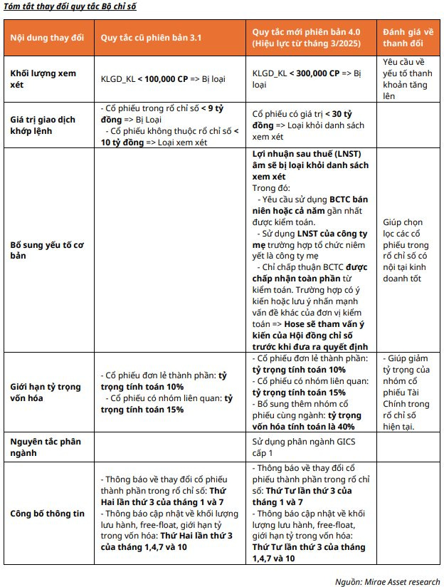 Ngoài ra, Quy tắc bộ chỉ số HOSE Index phiên bản 4.0 cũng sẽ chính thức được áp dụng trong đợt này. Tỷ trọng cố phiếu trong VN30 sẽ có thay đổi đáng kể khi việc bổ sung điều kiện ”Nhóm cổ phiếu cùng ngành: tỷ trọng vốn hóa tính toán là 40%” làm giảm đáng kể tỷ trọng của nhóm cổ phiếu ngân hàng. Hiện nhóm này đang chiếm khoảng 57% vốn hóa chỉ số theo bộ quy tắc cũ.